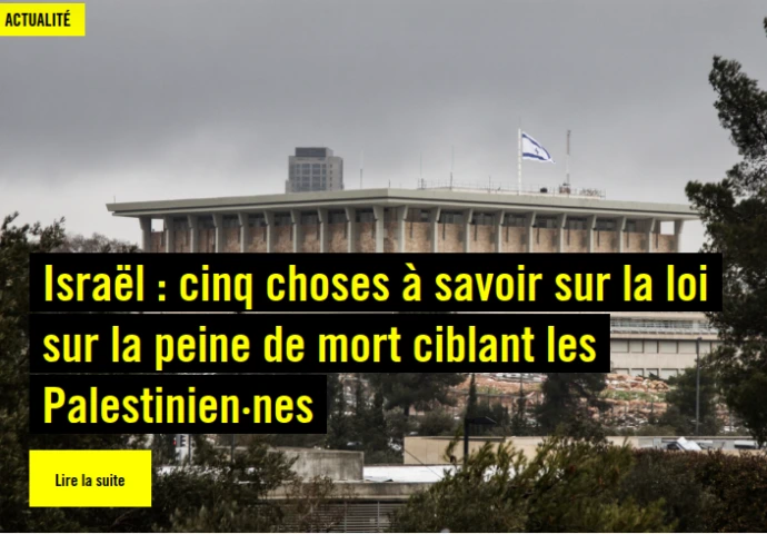 La Knesset a approuvé, lundi 30 mars, une loi qui permet à des tribunaux d’imposer la peine de mort aux personnes reconnues comme « terroristes » par Israël. Cette loi rétrograde et dangereuse cible clairement les Palestiniennes et Palestiniens. Nous appelons à son abrogation immédiate.
